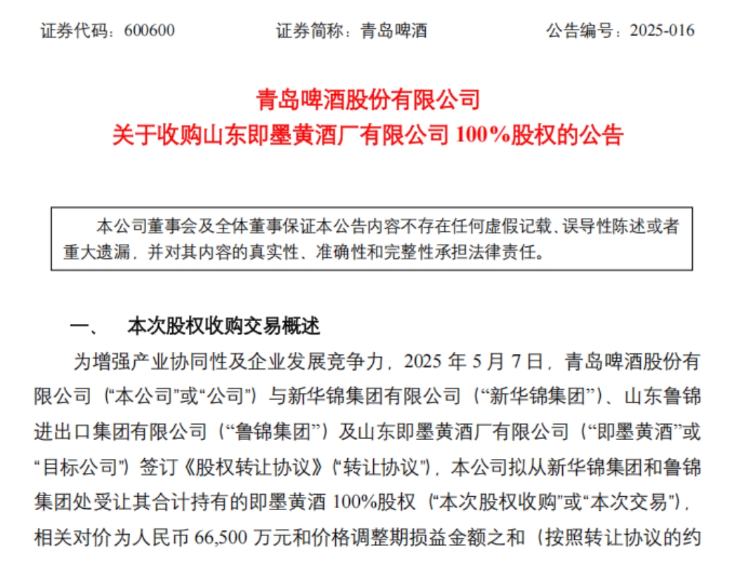 为增强产业协同性及企业发展竞争力,2025年5月7日,青岛啤酒股份有限公司(“本公司”或“公司”)与新华锦集团有限公司(“新华锦集团”)、山东鲁锦进出口集团有限公司(“鲁锦集团”)及山东即墨黄酒厂有限公司(“即墨黄酒”或“目标公司”)签订《股权转让协议》(“转让协议”),本公司拟从新华锦集团和鲁锦集团处受让其合计持有的即墨黄酒100%股权(“本次股权收购”或“本次交易”),相关对价为人民币66,500万元和价格调整期损益金额之和(按照转让协议的约定,“价格调整期损益”是指经审计的目标公司及其子公司在审计评估基准日净资产扣除过渡期内目标公司向股东利润分配的金额与经审计的交割日净资产的差额)。本次股权收购交易完成交割后,本公司将持有即墨黄酒全部股权,即墨黄酒成为本公司的全资子公司,纳入公司合并报表范围。