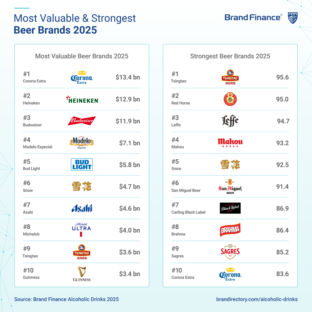 7月16日,英国品牌评估机构“Brand Finance”(品牌金融)发布了《2025全球酒精饮料品牌价值榜》(Alcoholic Drinks 2025)。