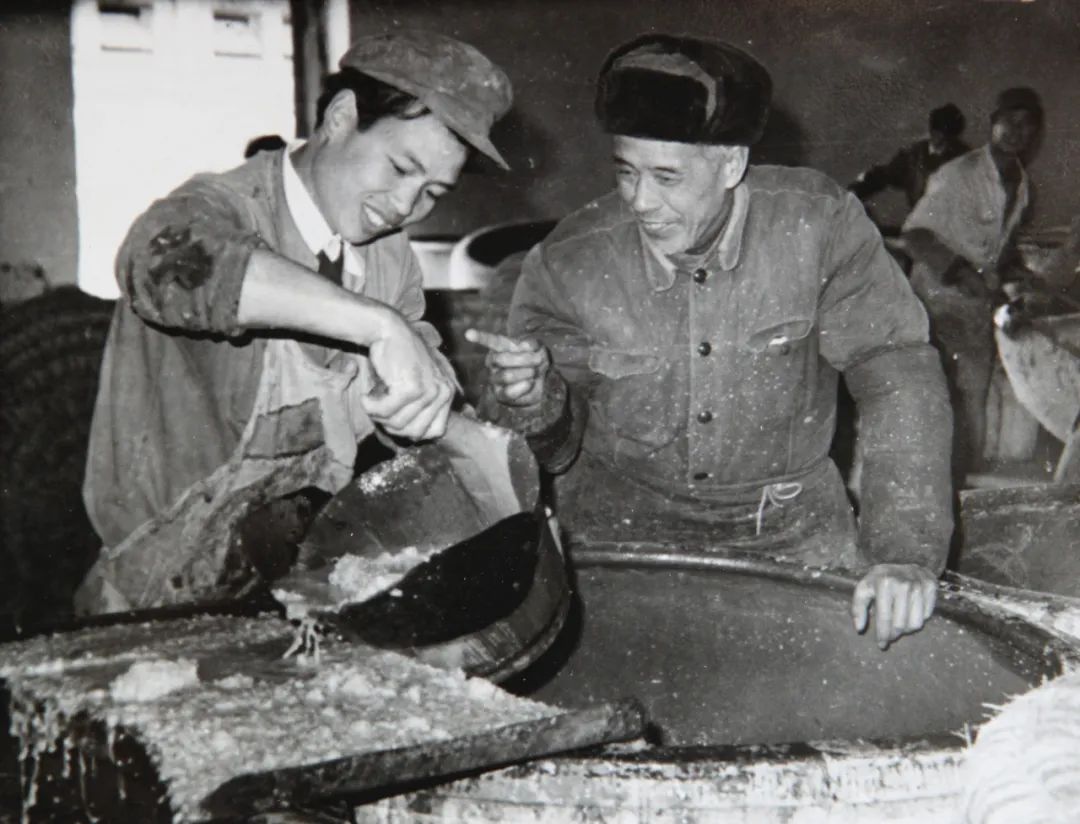 王阿牛(右)正在作坊里指导新技工开耙(1980年摄)