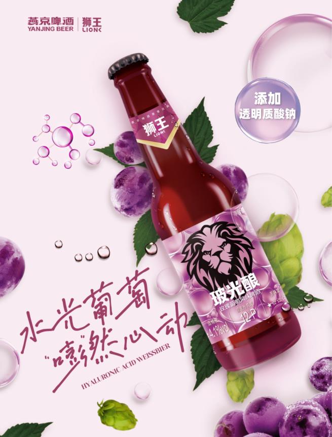 全新上市的燕京狮王玻光酿玫瑰葡萄精酿啤酒产品旨在打造“玻尿酸、女性啤酒”概念,精选原料,独创工艺配方,添加红葡萄汁与透明质酸钠,打破传统壁垒,将玻尿酸与葡萄等经典果味复合混搭而成一款新的产品。